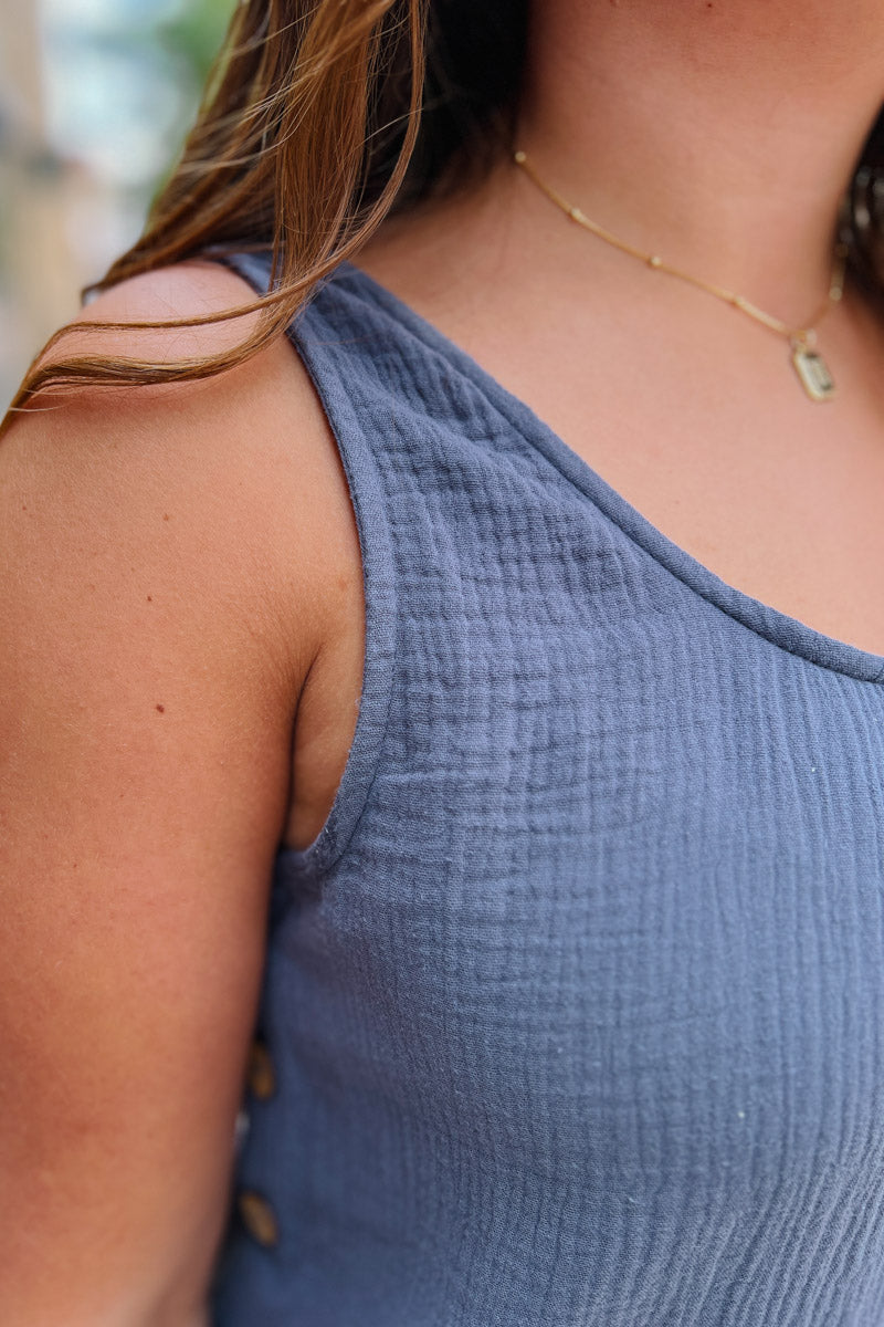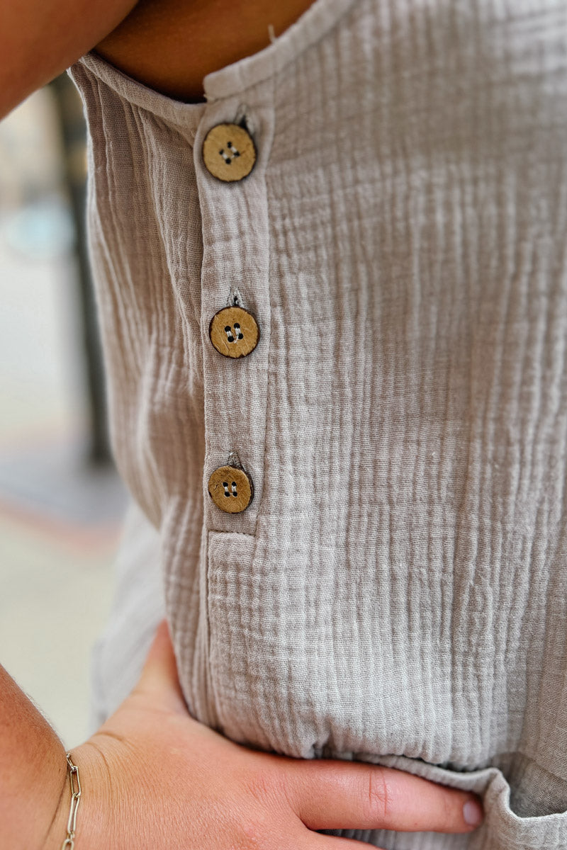 The Brooklyn Gauze Romper with Side Button offers lightweight comfort with its soft gauze material, making it easy to wear throughout your day. Designed for effortless style and breathability, this romper supports your need for both comfort and practicality without compromising on a flattering fit.