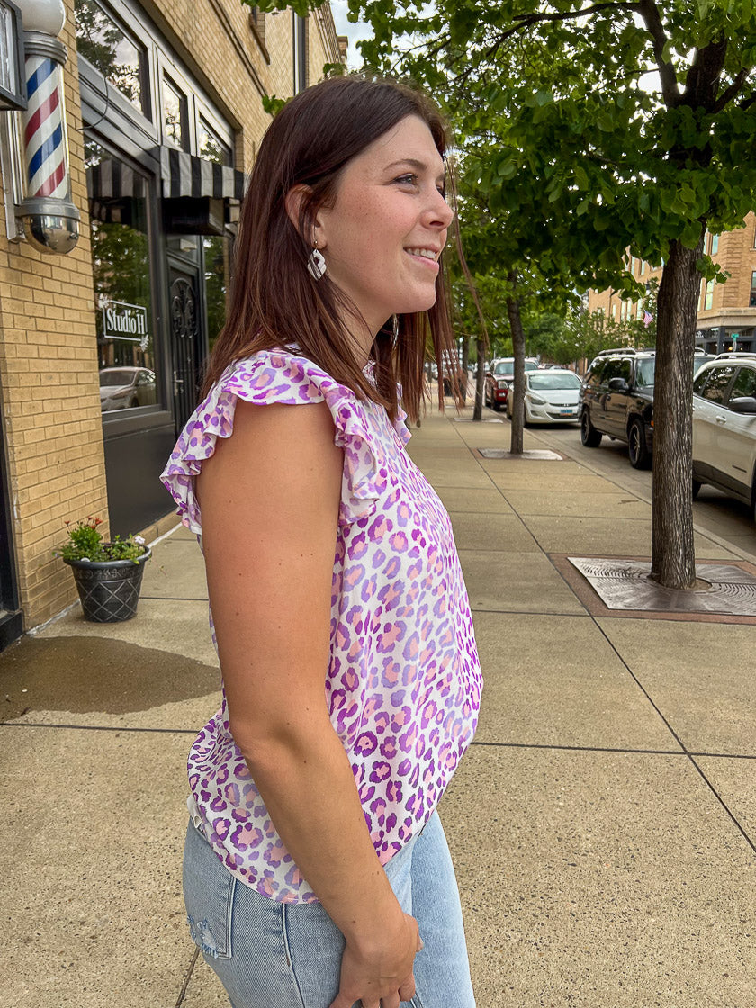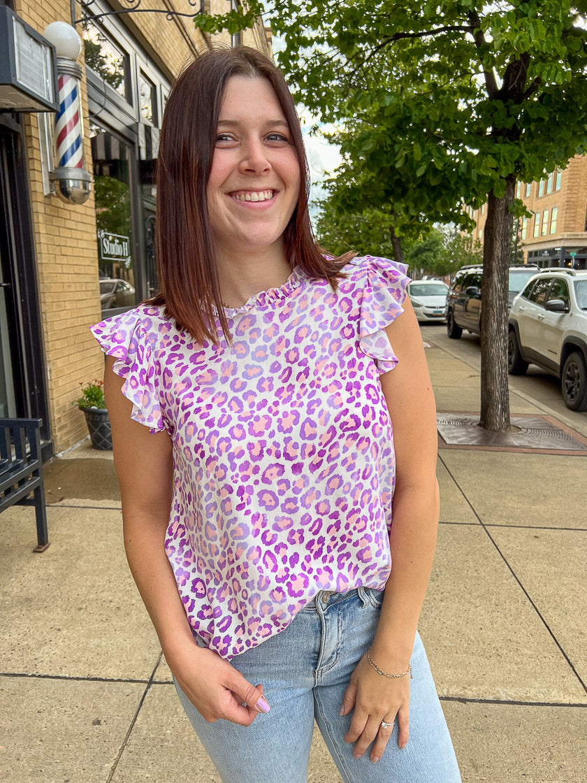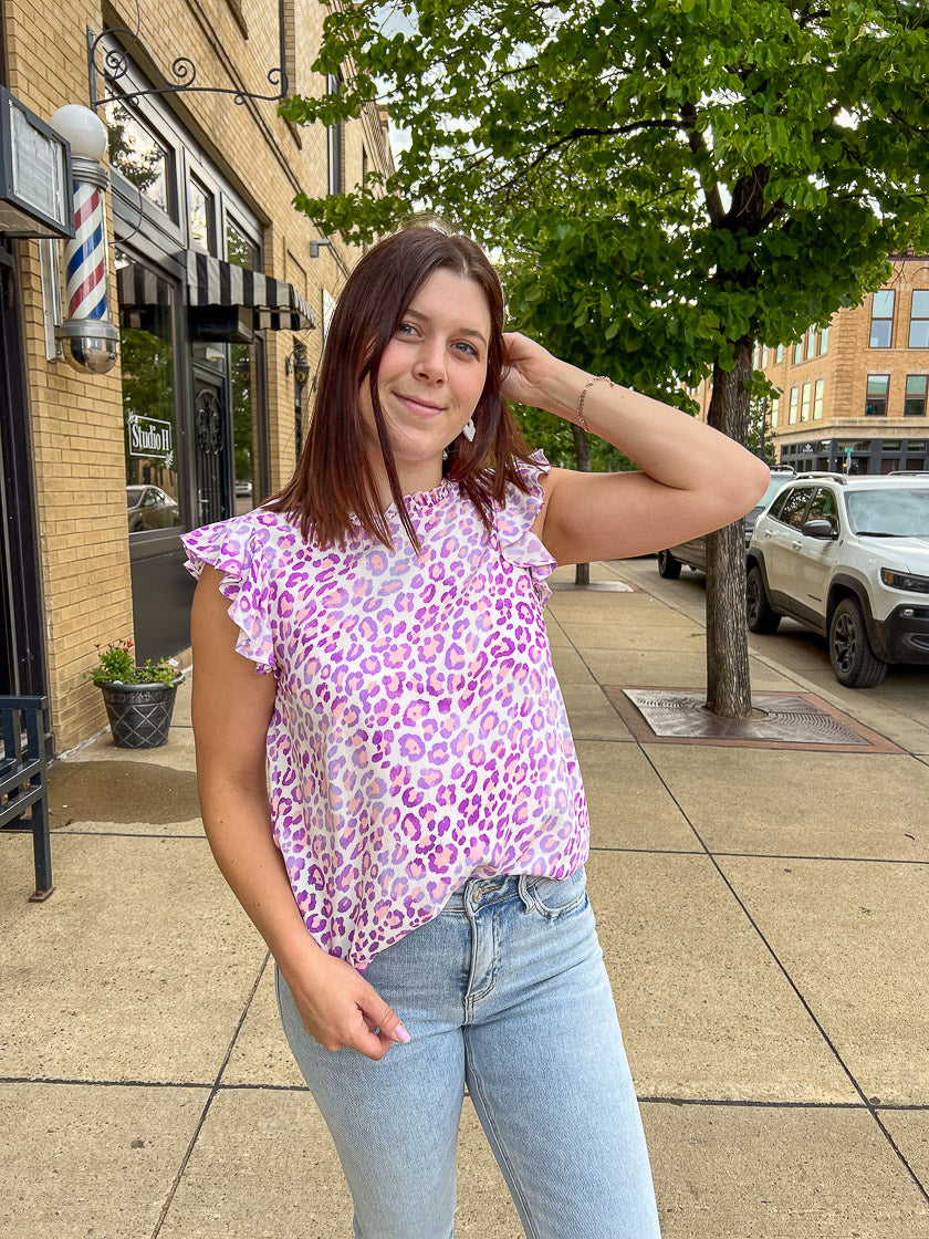 Add a playful spin to your leopard print with our Can't Be Tamed Leopard Top. The flutter sleeve detail adds a touch of femininity to the bold leopard print in pink and electric purple. Lightweight and flowy, this top is perfect for taking your outfit the extra mile.