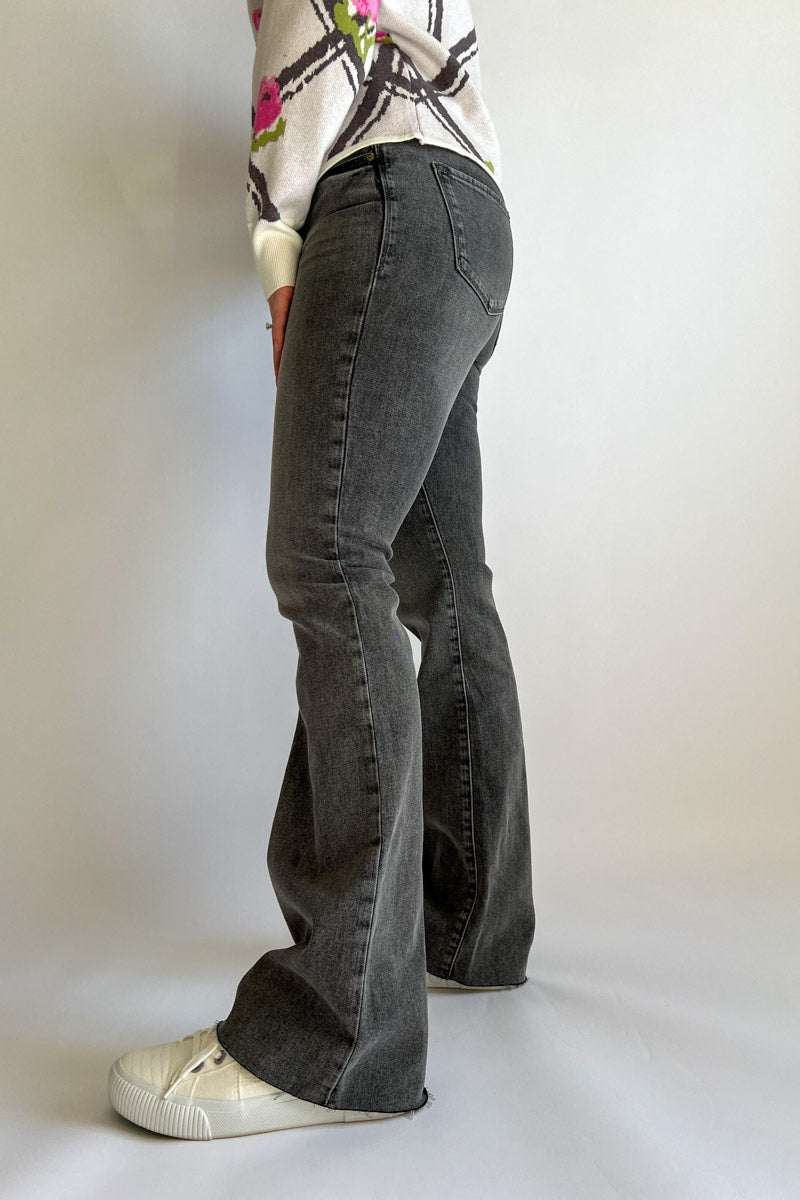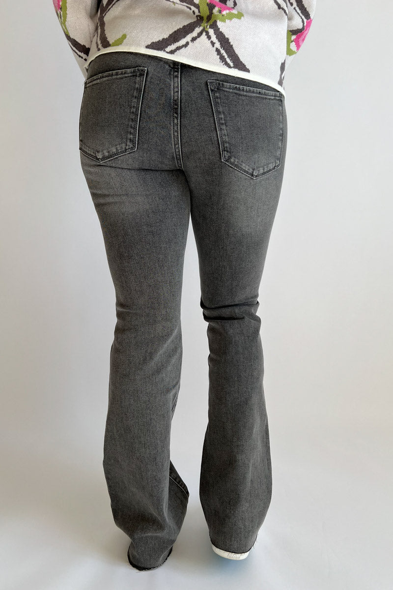 Kick it up a notch with our Jaxtyn Flare in Middlebrook! These sassy gray-washed jeans feature a raw hem that adds just the right amount of edge. With zero destruction details, they stay polished while the flared silhouette brings all the fun vibes. They are a leg-lengthening stunners!