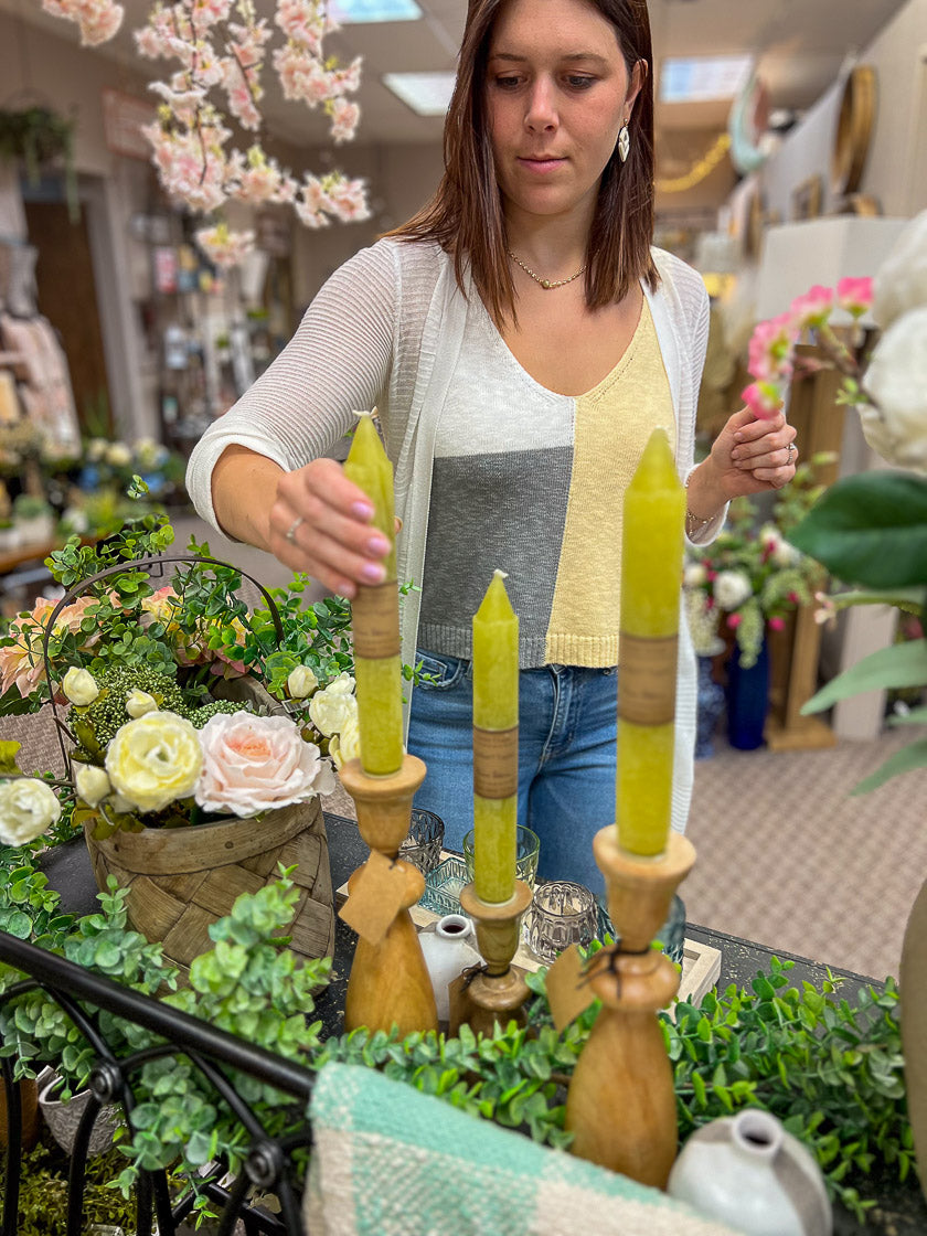 Let us introduce you to the Timber Taper. An elegant, wider timber trunk candle that adds a touch of luxury to any space. With a 1.25" diameter and 10" height, these tapers are designed to burn clean for 15 hours, creating a long-lasting and beautiful ambiance. Elevate your home decor with Timber Tapers.